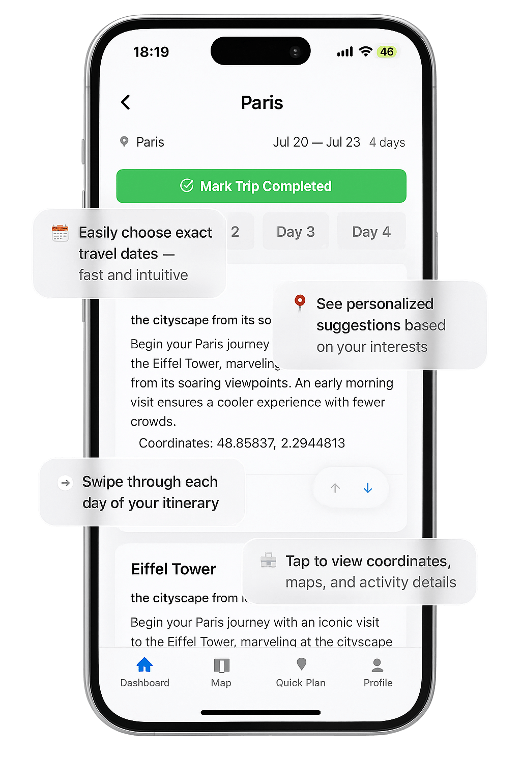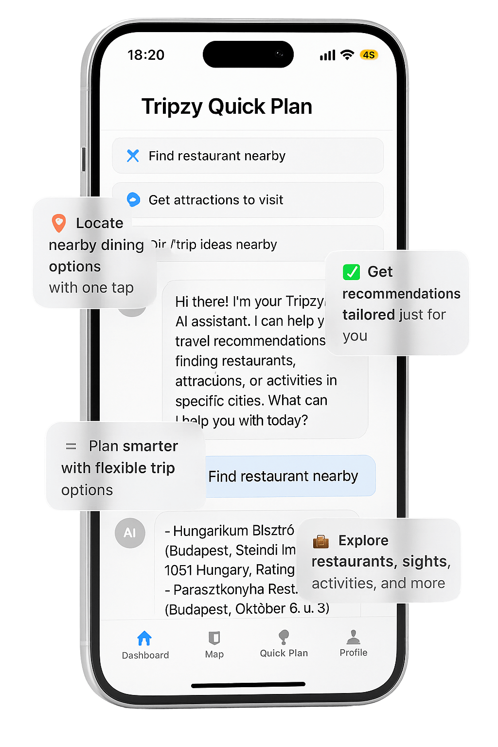 Let AI suggest restaurants, attractions, and activities around you or simply ask anything from the specific city.